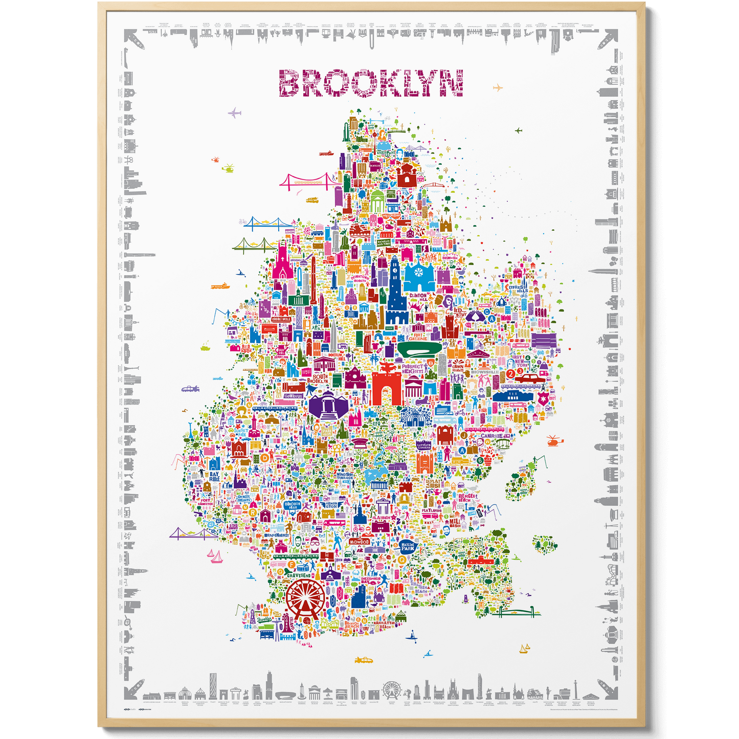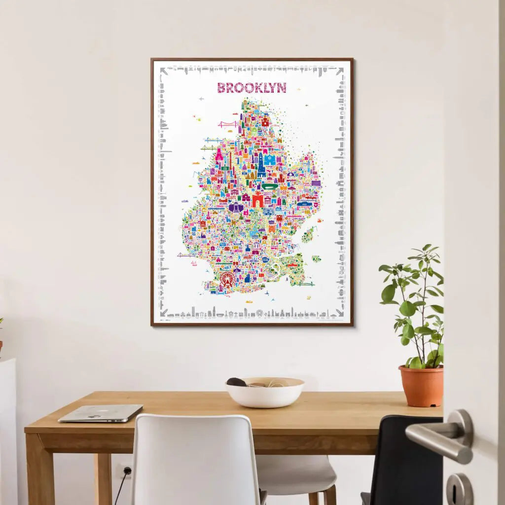 “Spread love, it’s the Brooklyn way.” That spirit pulses through every inch of the Iconic Brooklyn Poster – Colorful Edition, an illustrated map made up of over 600 hand-drawn icons celebrating one of New York City’s most storied boroughs. From parks and parades to bridges and brownstones, this vibrant wall art invites you to rediscover Brooklyn with curiosity, affection, and pride.