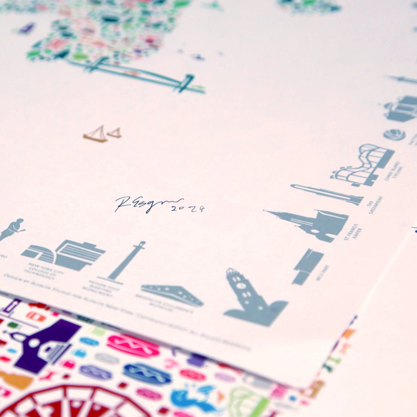 Each print comes with a Letter of Authenticity and a beautifully printed index card identifying all 600+ icons — including 59 celebrities, 51 neighborhoods, 48 museums and galleries, 42 houses of worship, 23 monuments and memorials, 15 sports clubs and arenas, 10 bridges, 5 classic films, 4 cemeteries, 3 carousels, 2 Jimmies, and 1 puppet library.
