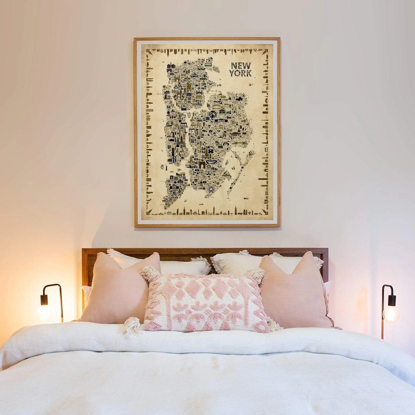 Featuring over 600 hand-drawn icons, this sepia-toned illustrated map print captures the timeless beauty of all five boroughs—Manhattan, The Bronx, Brooklyn, Queens, and Staten Island—in one richly detailed work of art. From historic landmarks and legendary figures to vintage architecture and classic NYC moments, it’s a soulful tribute to the City That Never Sleeps.